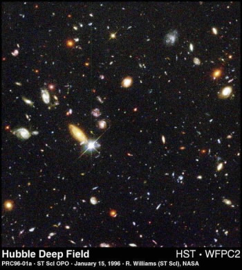 FOR ten consecutive days in December of 1995, the NASA Hubble Space Telescope, orbiting far above the Earth’s atmosphere, pointed its lens toward what seemed an "uncluttered" portion of the sky in the constellation Ursa Major. Astronomers narrowed the focus of the telescope to a tiny speck of black sky about the size of a dime 75 feet away. The resulting image, assembled from over 300 separate exposures, appears on the back cover of this issue of EarthLight.